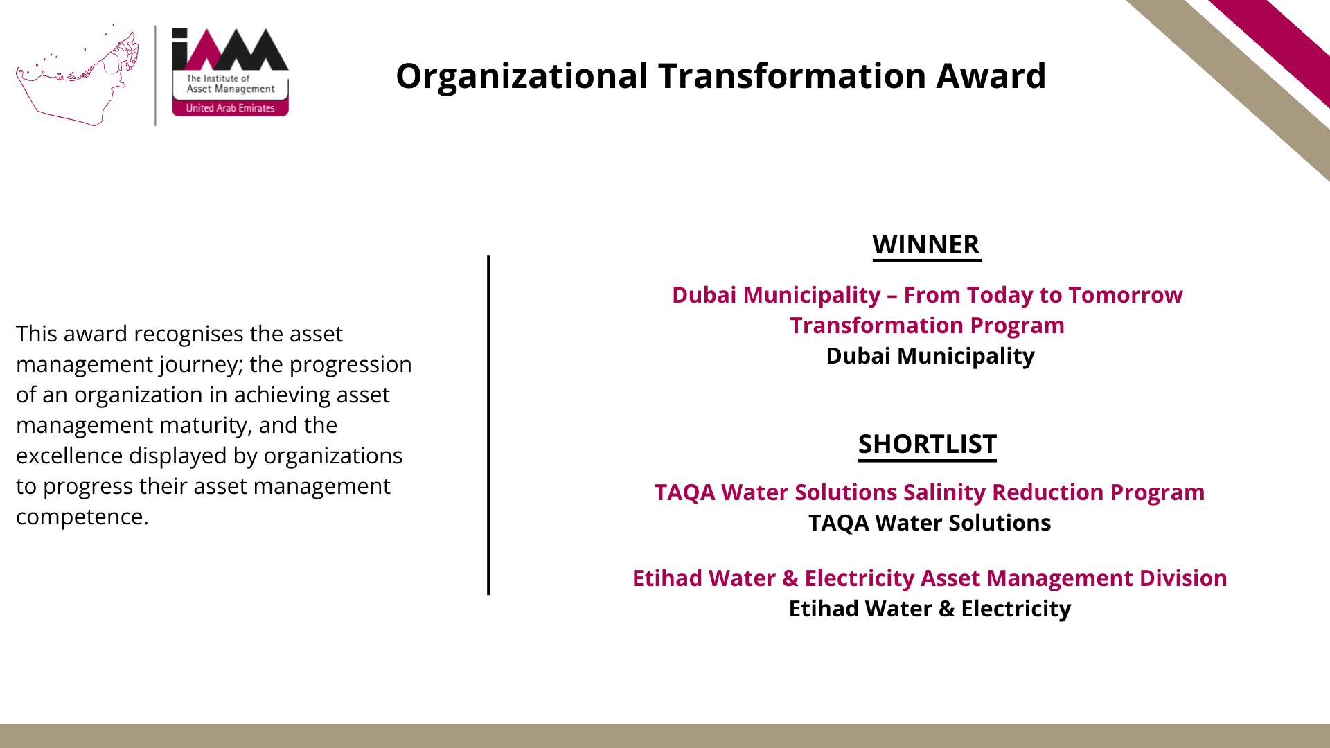 - IAM UAE Organization Transformation Award – Dubai Municipality – From Today to Tomorrow Transformation Program