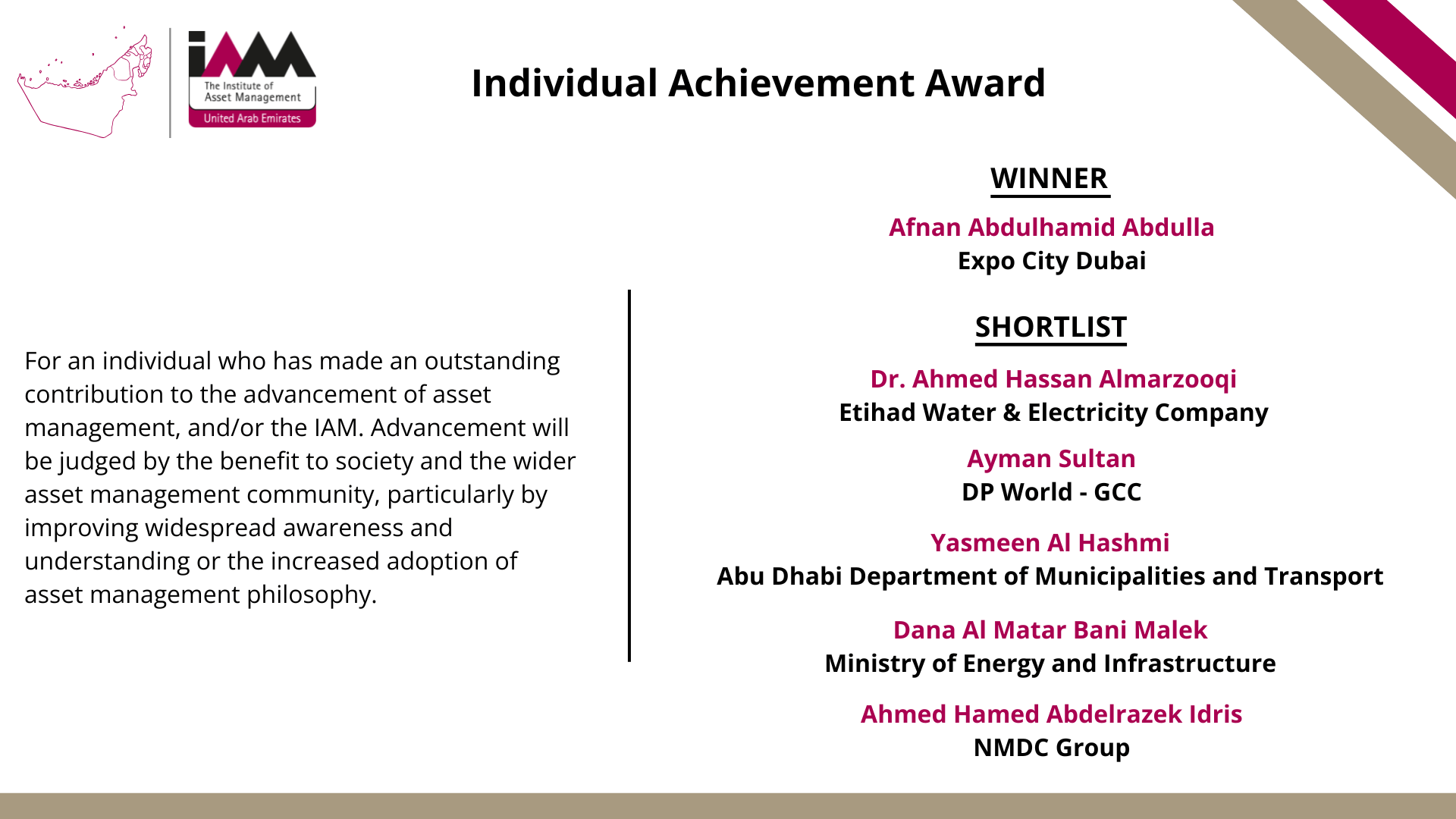 - IAM UAE Individual Achievement Award – Afnan Abdulla
