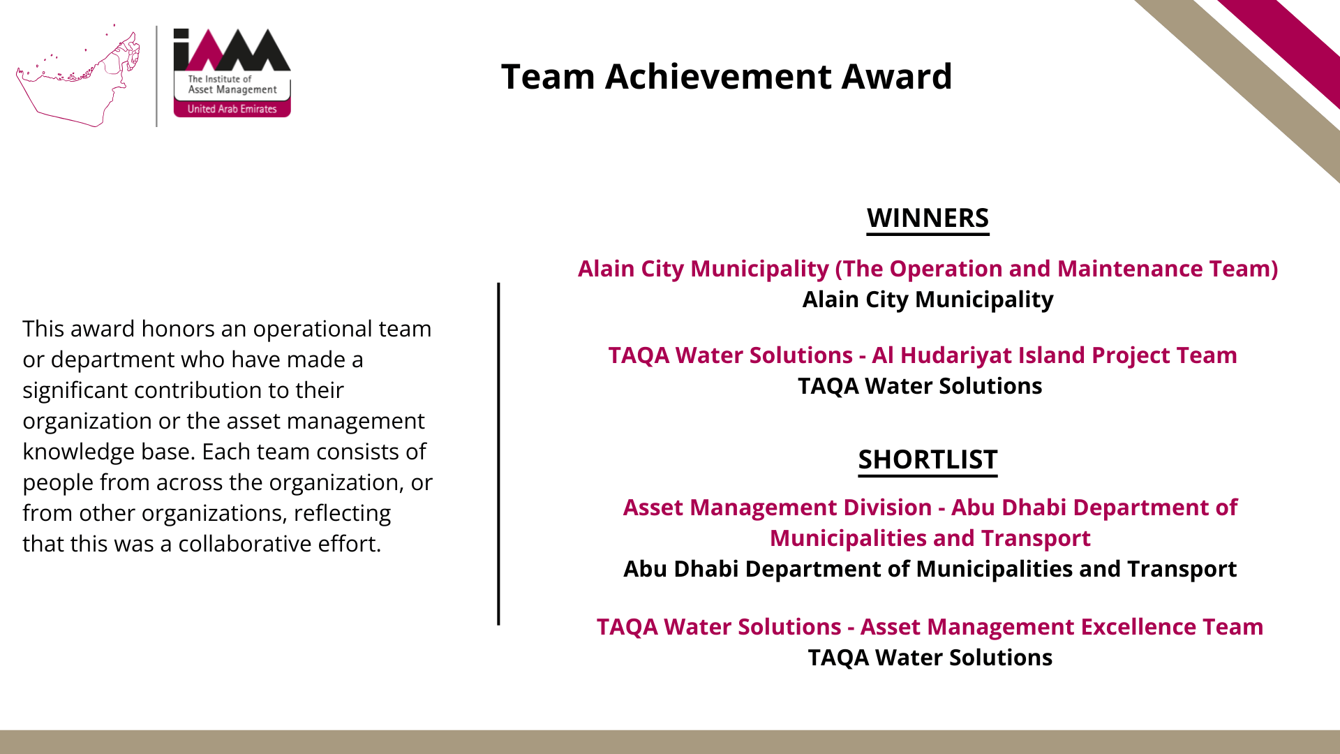 - IAM UAE Team Achievement Award - Alain City Municipality (The Operation and Maintenance Team)
