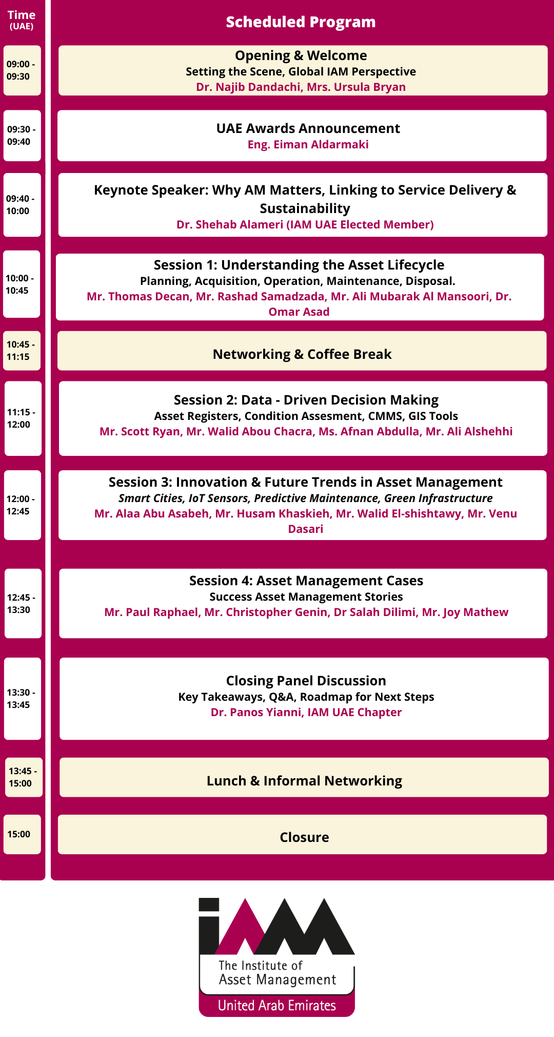 This one-day conference builds on our Chapter’s vision to bring together leading voices from the UAE and wider GCC to exchange knowledge, showcase success stories, and drive momentum for structured AM practices aligned to ISO 55000.