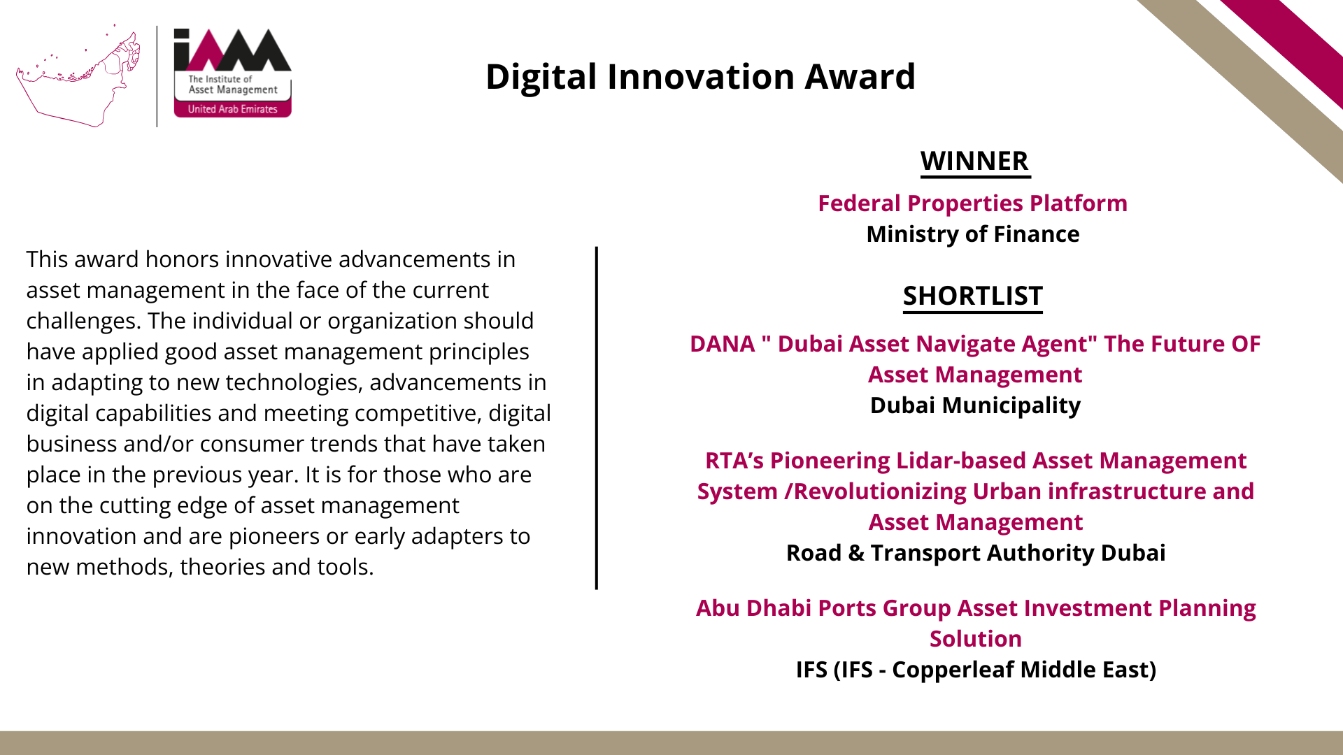 - IAM UAE Digital Innovation Award – Ministry of Finance - Federal Properties Platform