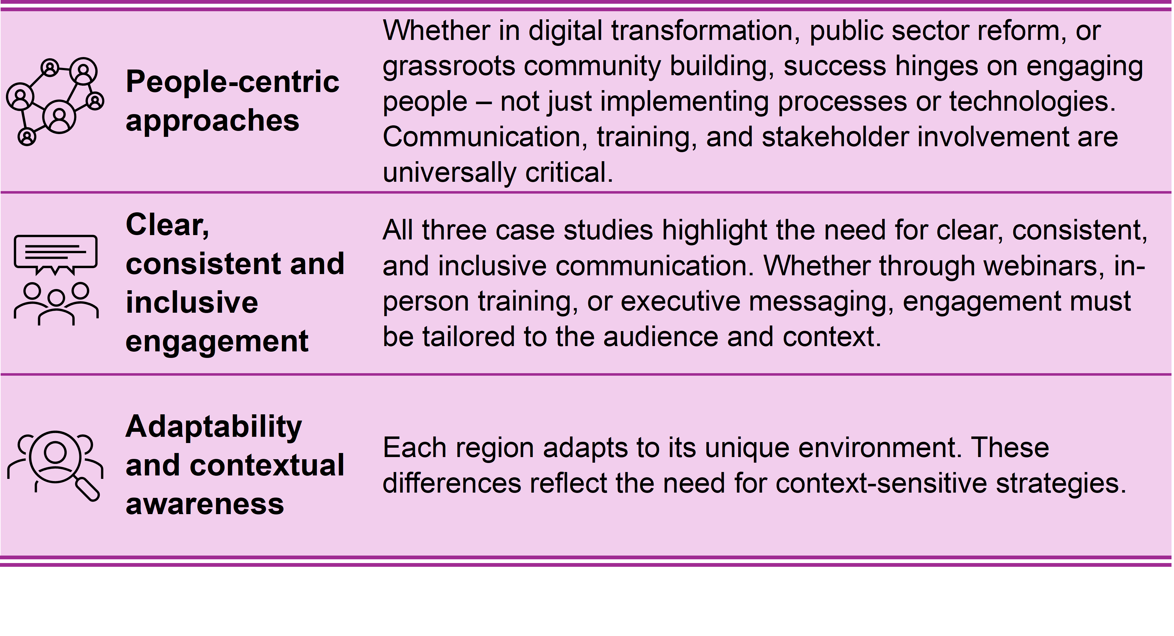 Finally, addressing resource and skill shortages through benchmarking against similar organisations helps build a strong case for additional support. In summary, public sector change management success relies on strong sponsorship, strategic coordination, clear communication, cultural alignment, and resource readiness to deliver meaningful, sustainable outcomes for communities.