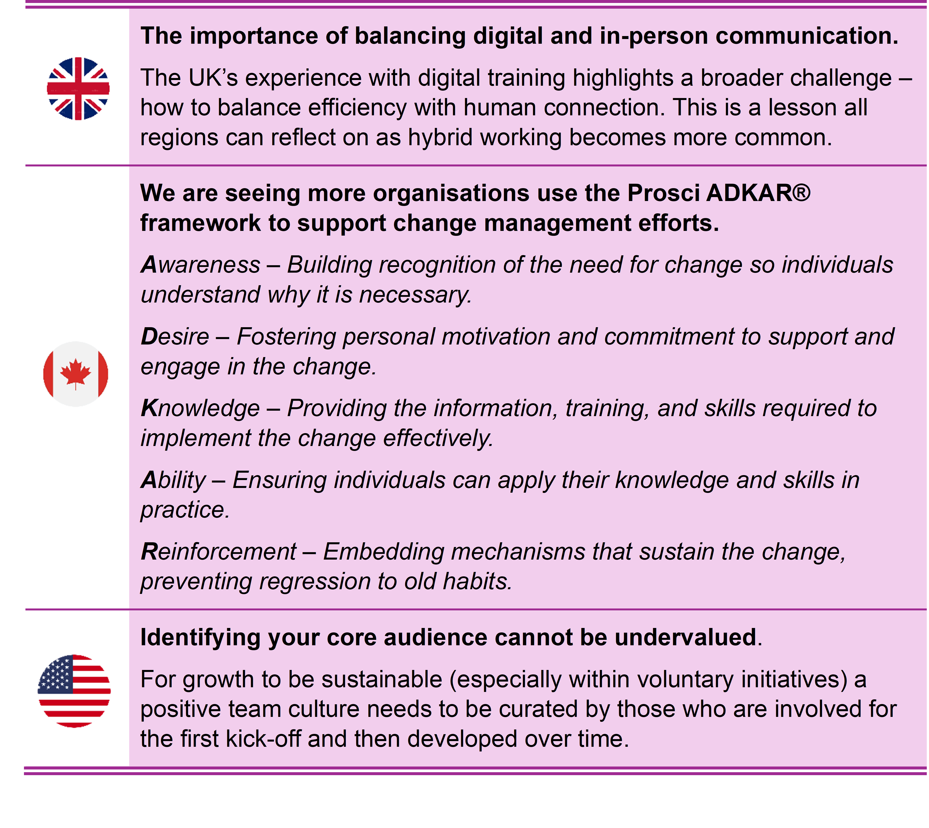 The importance of in-person interactions is not limited to digital transformations but is especially important when training and behavioural change is involved. In the UK private sector, managing change effectively often hinges on how we communicate. It is easy to assume that most professionals are comfortable with digital tools, but this is not always the case. Data collected and analysed by Statista from 2024 identified that 12% of the UK population are not internet users[1] – a reminder that digital literacy cannot be taken for granted. This has real implications for how we design and deliver change programmes. Highlighting the importance of inclusive training methods that accommodate varying levels of digital literacy.