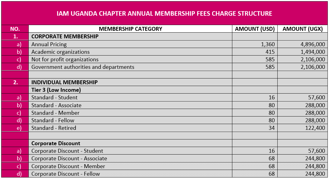 Below is a breakdown of the annual membership fees for the Institute of Asset Management Uganda Chapter. Please review the applicable membership category and corresponding fee before proceeding with payment.